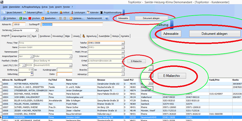 Die Schaltfläche „Adressakte“ zeigt kundenbezogene Dokumente.